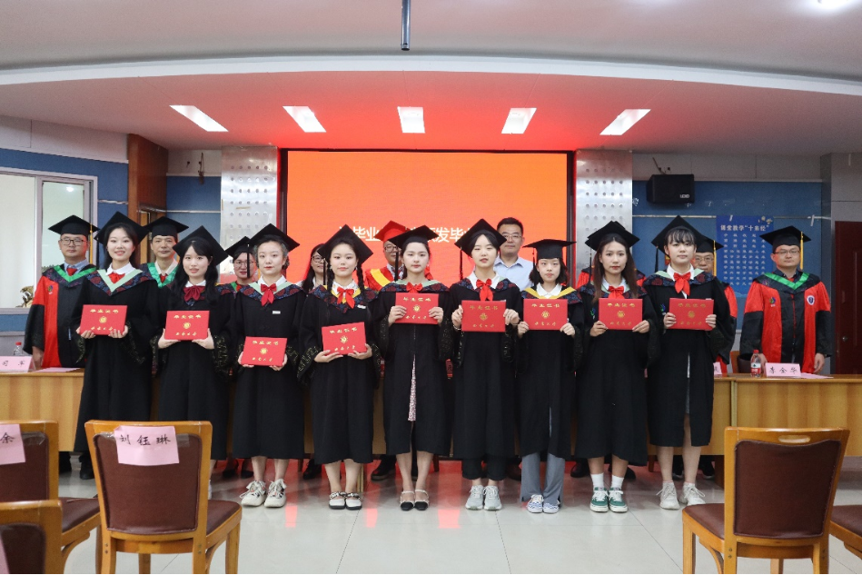 学院党委书记潘玉锋宣读《西南大学关于准予2023届全日制普通本科学生毕(结)业的决定》,学术委员会副主任王海洋宣读《西南大学学位评定委员会关于2023春季学期学士学位授予的决定》。在青春激扬的音乐中,学院领导、学术委员会成员、教师代表为毕业生代表颁发毕业证书,为学位获得者授予学位。