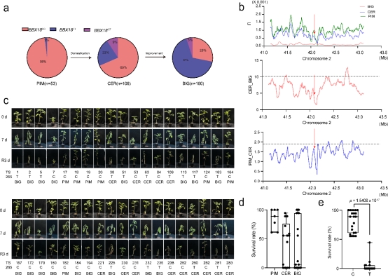 学院园艺植物发育与逆境生物学创新实验室李金华教授团队联合华中农业大学张俊红教授团队于9月13日在国际知名期刊《Nature Communications》上在线发表了题为“A truncated B-box zinc finger transcription factor confers drought sensitivity in modern cultivated tomatoes”的研究论文。该论文从番茄种质(醋栗PIM,樱桃CER和大番茄BIG)进化上发现了一个抗旱相关的重要SNP,该SNP会导致一个B-box锌指转录因子BBX18的提前终止并影响基因的转录活性。通过调查321份番茄种质资源核苷酸的多样性,发现在该SNP突变在番茄进化过程中是自然突变形成的。不同种番茄资源进行耐旱性分析,发现番茄的抗旱性是和该SNP的突变类型是密切相关的。