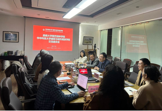 11月26日下午,学院一行来到华中科技大学建筑与城市规划学院开展调研。华中科技大学建筑与城市规划学院党委书记李小红、院长谭刚毅、景观学系主任戴菲、景观学系副主任赵纪军、景观学系副主任徐利权、景观系教授万敏、学院组织员黄丽娟等参加座谈。李小红对学院一行来访表示欢迎,并对我院新近获批风景园林专业博士授权点表示祝贺。谭刚毅介绍了建筑与城市规划学院概况、学科构架以及学科专业建设所面临的机遇与挑战。潘玉锋对建筑与城市规划学院的党建工作和学科建设取得的成效表示祝贺,认为学院高质量党建对高质量事业发展发挥了很好的引领作用,很多做法值得学习。周建华介绍了学院风景园林专业发展历程,并期待两院未来在风景园林学科建设等领域加强合作,特别是欢迎华中科技大学的优秀博士来渝工作。座谈会上,双方围绕风景园林专业博士点建设、教师引育政策等议题进行了讨论。座谈会前,潘玉锋面向建筑与城市规划学院部分博士毕业生介绍了我院概况,并对人才引进政策进行了说明。座谈会后,学院一行参观了建筑与城市规划学院的党建活动阵地与虚拟仿真实验室。