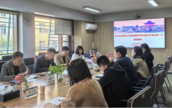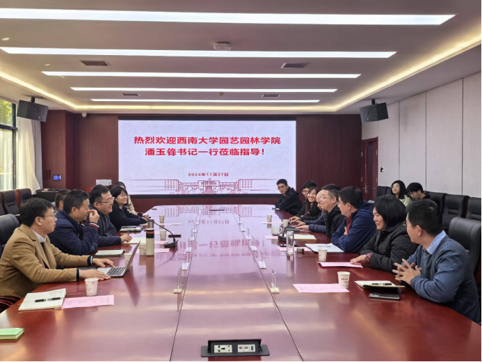 11月27日上午,学院一行在华中农业大学园艺林学学院进行调研。华中农业大学园艺林学学院党委书记龙健飞、党委副书记林辉、设施与智慧园艺系教授欧阳波、风景园林系副教授杜雁、园艺系副教授吴巨勋等参加座谈交流。龙健飞对学院一行到来表示欢迎,他从建院历史、学科优势、科研成果、人才培养、师资队伍建设、社会服务、文化建设、国际合作与交流等方面介绍了有关情况。潘玉锋对学院的热情接待表示感谢,他表示,华中农业大学园艺林学学院在园艺园林领域拥有深厚底蕴和独特优势,园艺学科排名全国首位,希望此行能够学习园艺林学学院在党建引领、学科建设以及人才引育工作方面的成功经验和先进做法,并进一步加强两院间的交流合作。双方就党建体系的构建与创新、园艺学科建设规划与新增长点培育、教师引育政策和职称评审等内容进行了深入探讨。座谈会上,学院一行与园艺林学学院的博士研究生们进行了交流,对西南大学人才引进政策进行宣讲与解读。座谈会前,学院领导亲切慰问了从学院毕业、现在华中农业大学就读部分研究生同学;座谈会后,学院一行实地参观考察了华中农业大学国家柑橘育种中心等教学科研基地。
