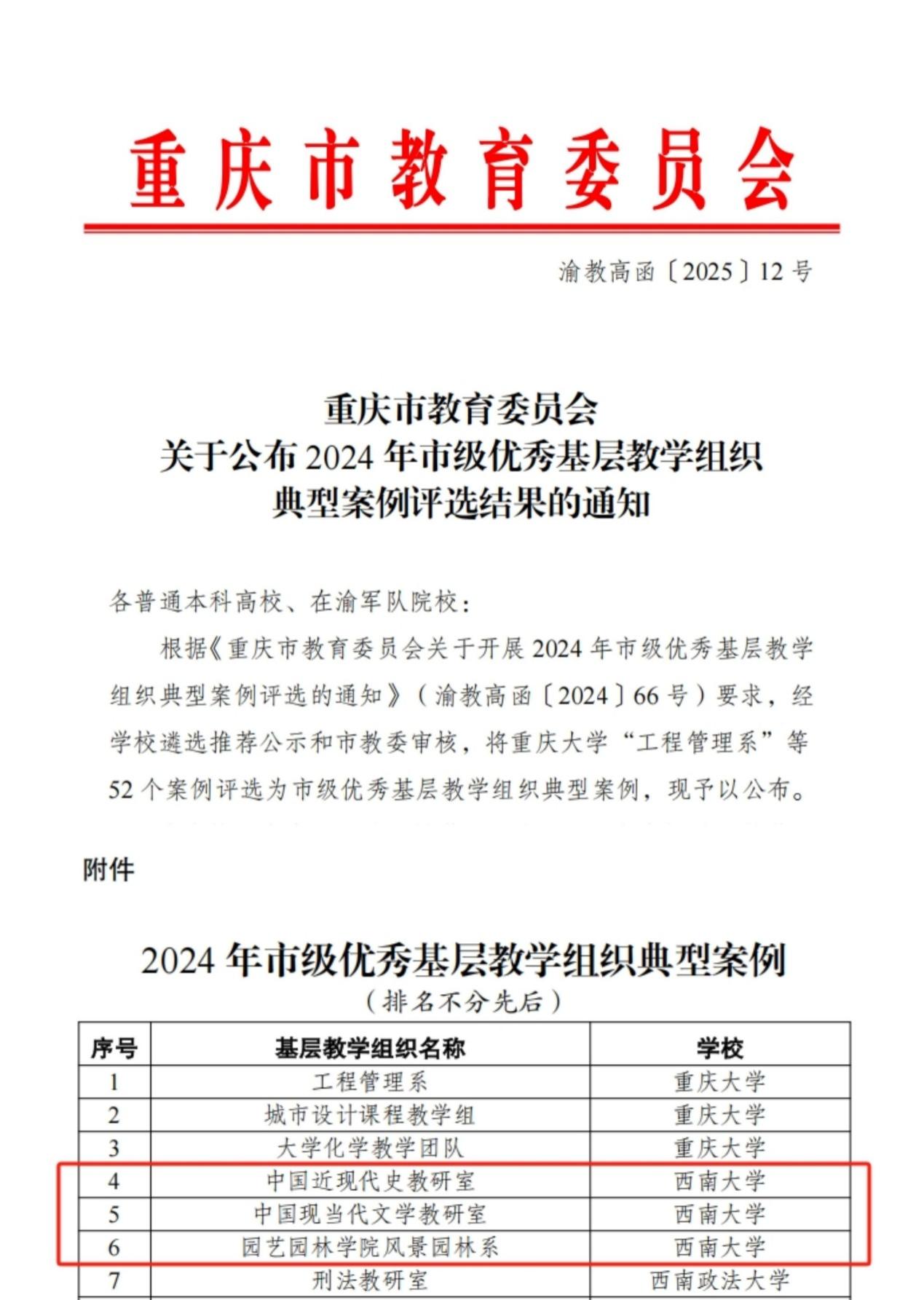 重庆市教育委员会近期发布《关于公布 2024 年市级优秀基层教学组织典型案例评选结果的通知》,永利yl23411风景园林系基层教学组织获评优秀。