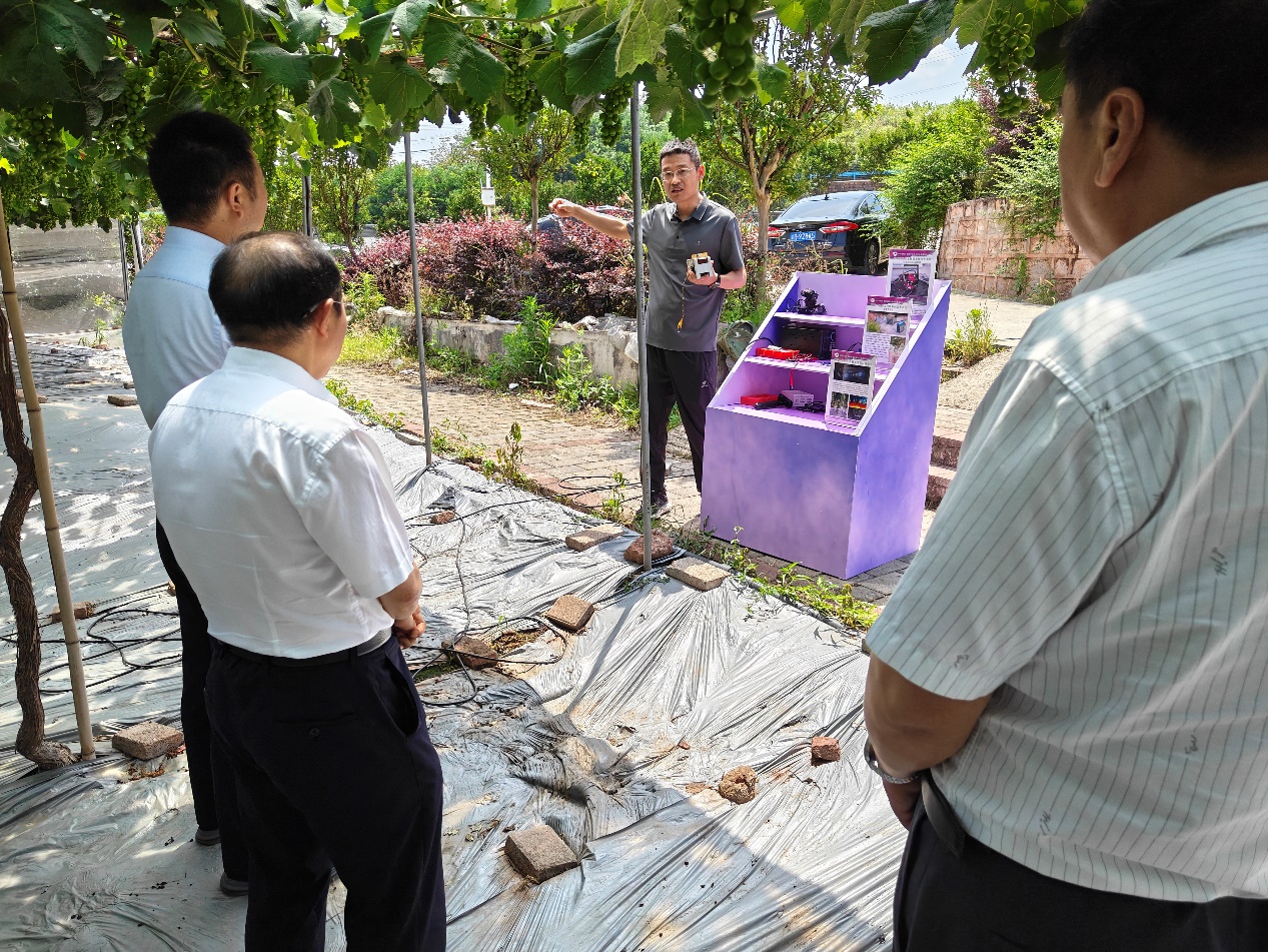 领导专家一行首先来到了阳光玫瑰避雨栽培大棚,科技小院依托单位重庆星期天农业科技有限公司总经理文婷婷介绍了公司与西南大学产学研合作的历程。2021年通过重庆市科技特派员项目与西南大学关心副教授、李明生副教授结识,共同提出通过激光技术、结合人工智能、机器视觉和基于深度信息的果穗识别图像处理等技术,解决全球葡萄产业栽培管理过程中修花果穗的瓶颈环节需求,2023年正式建成中国农技协重庆渝北葡萄科技小院,2024年研究生入驻科技小院。