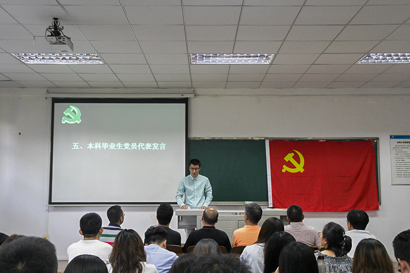 随后,研究生毕业党员代表余卓璠与本科生毕业党员代表叶召定分别发言,他们表示,感谢学院领导和老师的辛勤培养,定会不忘初心、牢记使命,坚持以合格党员的标准严格要求自己,努力学习,扎实工作,将为人民服务的宗旨贯穿到今后的工作与生活之中。