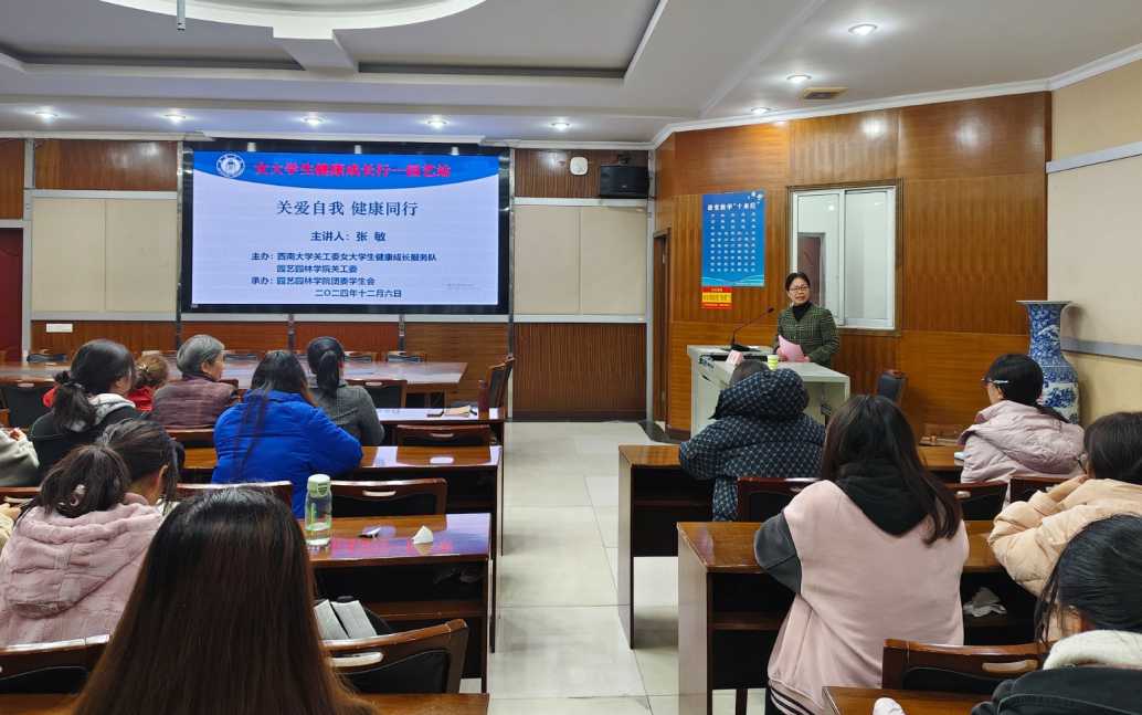 12月6日下午,由西南大学关工委女大学生健康成长服务队、园艺园林学院关工委主办,园艺园林学院团委学生会承办的“女大学生健康成长行——园艺站”专题讲座在33教学楼407教室顺利举行。本次活动邀请西南大学校医院妇产科主任张敏医生作“关爱自我 健康同行”主题讲座。西南大学关工委女大学生健康成长服务队教师,2024级本科生辅导员许淑雅和2023级、2024级本科生部分女同学参加了本次活动。讲座由西南大学关工委女大学生健康成长服务队教师、学院原党委书记李雪梅主持。