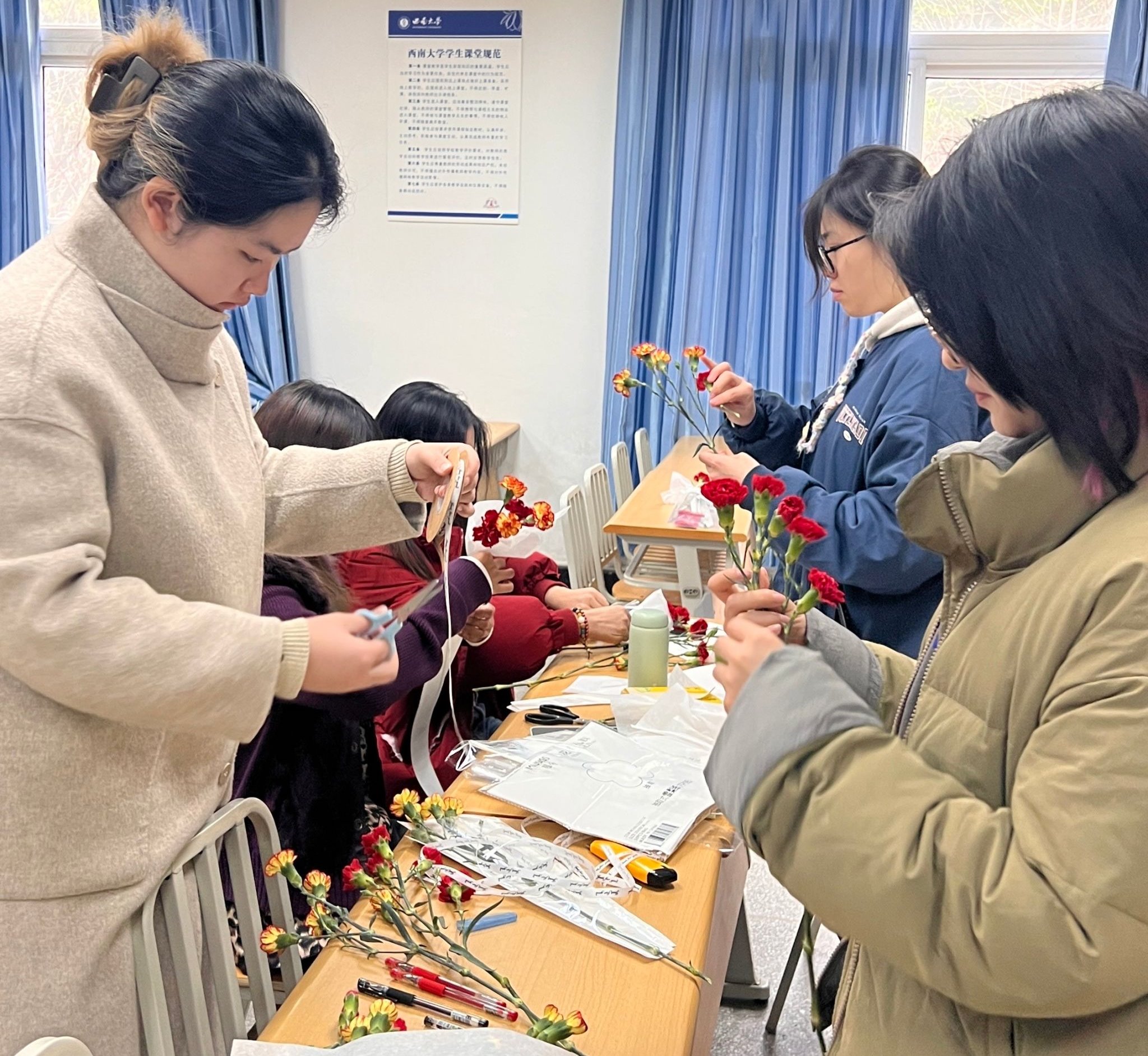 活动当日,教室内洋溢着忙碌而喜悦的气氛。同学们分工合作,将康乃馨、向日葵等花材精心修剪、包装,并系上丝带,搭配香薰、平安符、绿植、梳子、镜子等心意满满的小礼物。每一束鲜花都附有手写的祝福卡片,字迹虽显稚嫩,但饱含真挚情感,“感谢您日复一日的守护!”“愿您如鲜花般明媚灿烂!”