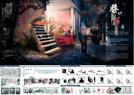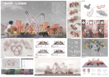 设计理念:对重庆的特色文化的思考是我们本次设计的缘起,围绕着城中山巷寻芳菲这一主题,我们对重庆的江水、桥梁、别具特色的街巷风貌进行解构重组,并最终设计出了以“江曲桥环· 山城魅影“为题的花园空间,以建造的方式来讲述山城故事,唤醒情感共鸣。花园空间的主体灵感来自于嘉陵江千厮门大桥,配景是一组高低错落的方格网架,勾勒出迷雾下的山城轮廓。通过灯光设计,勾勒独属于重庆的夜之绚烂;用风铃的悦耳声响,模拟江水涛涛之声;重庆独有的气候孕育多种灿漫的花卉植物,将花同构造相结合,呈现出别样的花卉之美。我们希望通过本设计,实现形与色的碰撞,声与影的结合,展现山城巷独特魅力,与观者共赴沉浸式文化体验之约。