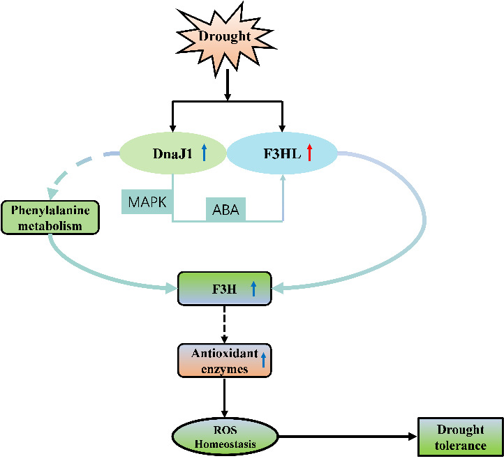综上,SpDnaJ1通过调控抗氧化相关基因的表达并介导类黄酮代谢途径,增强了番茄植株的抗氧化能力,从而提高了番茄的抗旱性。研究解析了DnaJ1- F3HL模块调控番茄抗旱新机制,并为抗旱基因工程策略的发展提供了重要的见解,这些策略旨在通过利用野生物种的基因来提高植物的抗旱性。