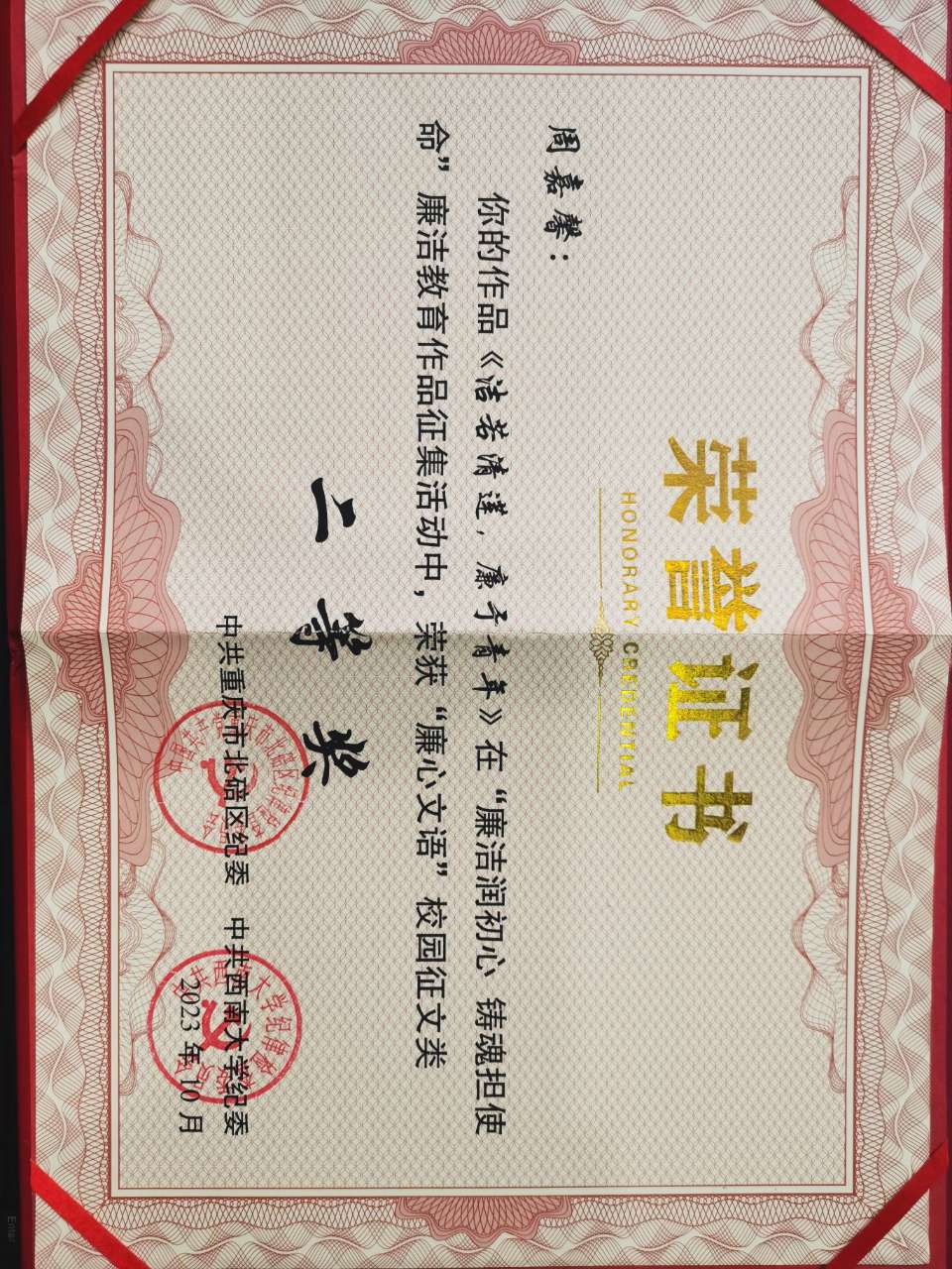 为深入学习贯彻党的二十大精神,贯彻落实党中央《关于加强新时代廉洁文化建设的意见》要求,围绕落实立德树人根本任务,纵深推进全面从严治党,重庆市北碚区纪委监委、西南大学纪委组织开展了“廉洁润初心 铸魂担使命”廉洁教育作品征集活动。征集活动开展以来,学院纪委高度重视,鼓励师生开展形式多样的廉洁文化创作活动,并选送优秀作品参加征集。最终,周嘉馨作品《洁若清莲,廉于青年》获得“廉心文语”校园征文类二等奖,李宜蒙、甘泉、王艺颖、薛鑫、马萍作品《莲与泥》获得“润心话语”视频征集类三等奖。